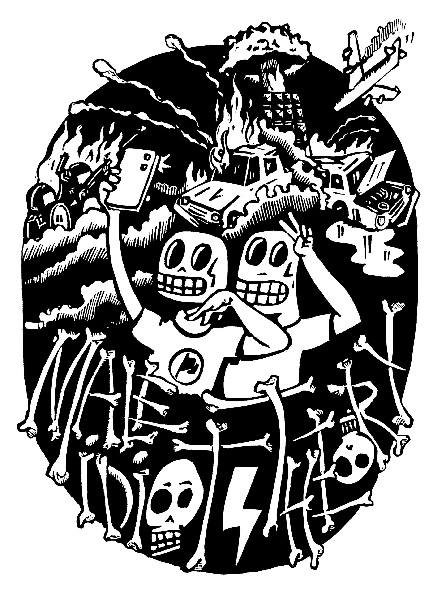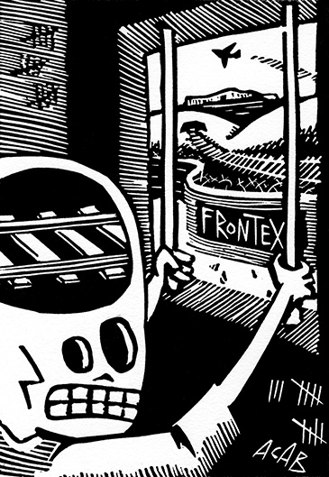 Sans remonter jusqu’à Posada (ou plutôt si), il y a une évidence quand on travaille en noir/blanc à explorer la mort/vie. « J’aurais pu perdre le pouvoir / De savoir le poids du blanc et du noir » (Eluard). Je reviens donc plusieurs fois par an sur ce thème, notamment pour la lino offerte aux amis qui visitent l’atelier chaque mois de juin.