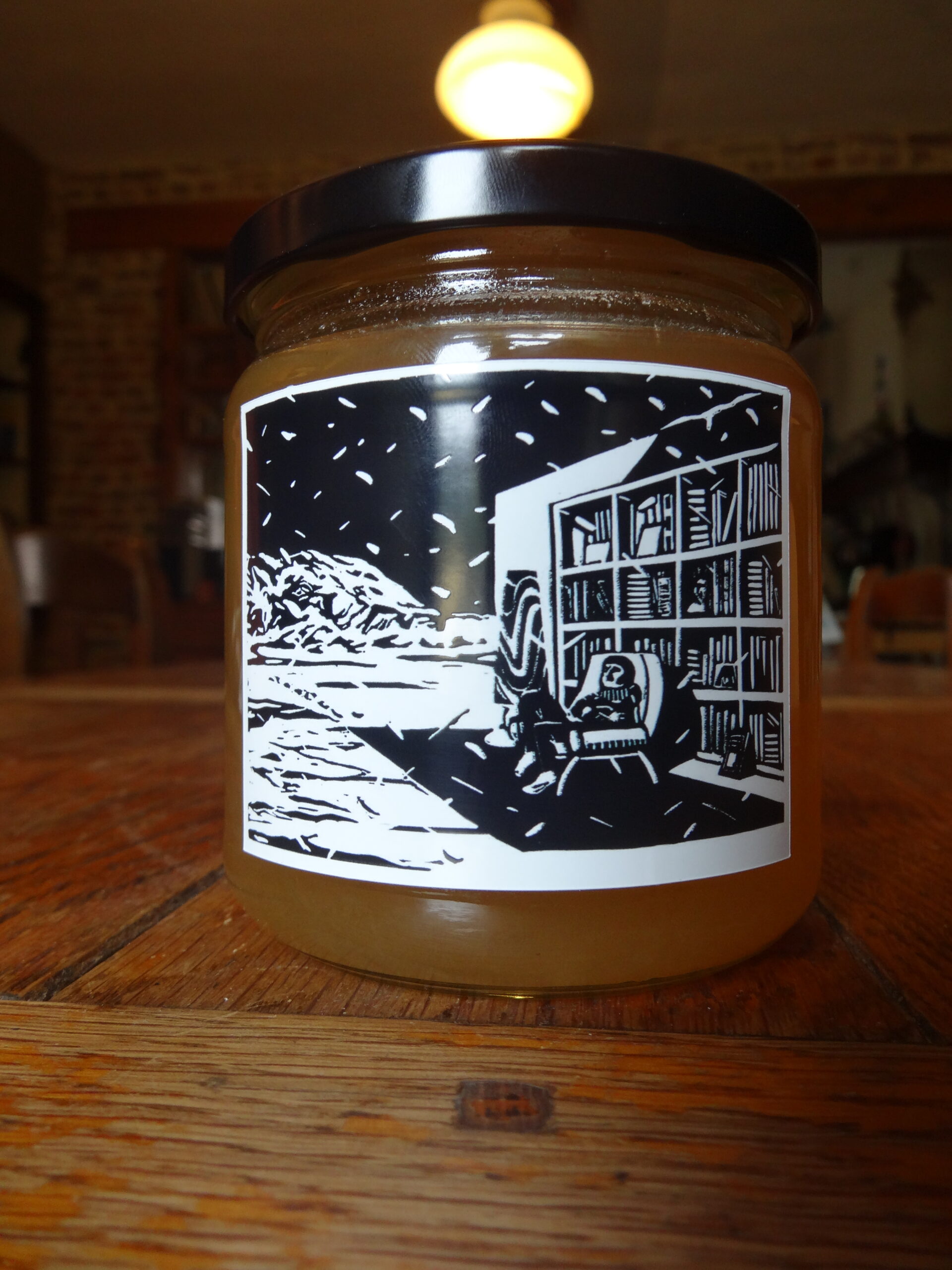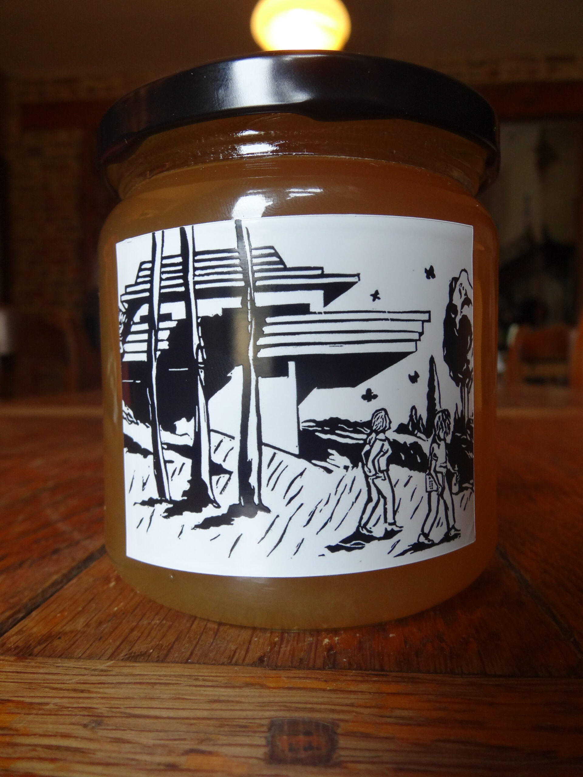 Mes gravures réutilisées comme étiquettes du miel de Porcheresse (printemps & été), les ruches sont à côté d’un champ de chanvre, dans les Freak Brothers ça aurait fait de la miellowana. Ici c’est juste très bon mais il n’y en a jamais assez.