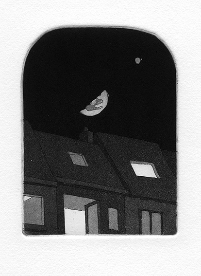 Petite aquatinte en passant, griffonnée au retour à pied d’une excellente soirée chez de nouveaux amis. Du balcon, sur les toits d’Anderlecht, curieux alignement entre la demi-lune et l’étoile polaire.
