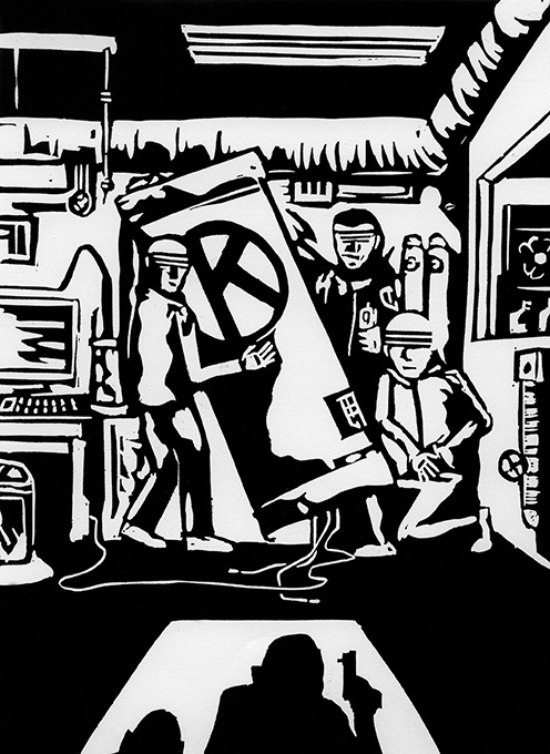 Petit cadeau à la personne qui fut (qui est) ma directrice de conscience professionnelle. Aujourd’hui mobilisée pour étudier l’histoire de l’art et autour de ses petits-enfants; le plus petit des trois présents sur la lino étant présentement au Japon. Le cadre au mur représente évidemment le Meiboom, du nom de la rue où elle m’a accueilli en 2012.