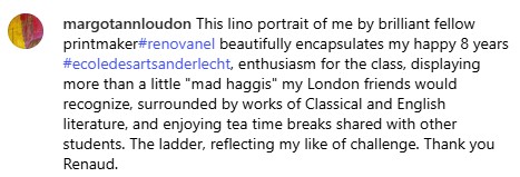 En juin 25, ma collègue d’atelier écossaise Margot Loudon, graveuse de grand talent, nous quitte. C’est la fin des discussions sur la poésie romantique anglaise (ah, Elisabeth Barrett Browning!), l’antiquité grecque et l’actualité anglaise. Adieu les biscuits londoniens pour le thé à la pause et les discussions sur le retour. Pour marquer le coup, je lui ai gravé un portrait au plus ressemblant (selon mes standards: l’intérieur de la tête est d’un photoréalisme remarquable). En bas de la gravure, c’est elle qui s’en va de son pas dynamique vers son nouvel atelier.