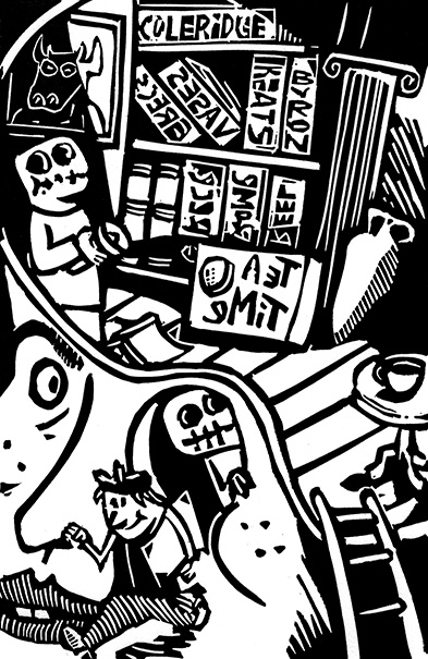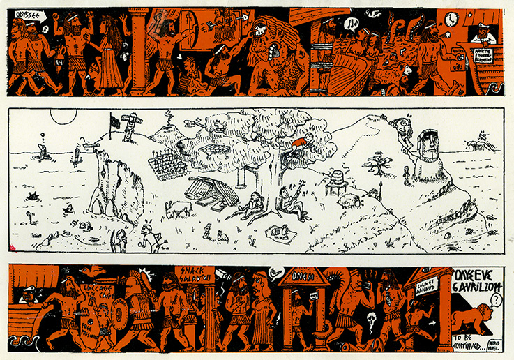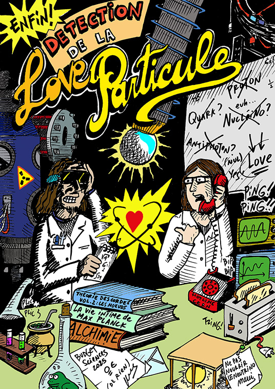 Tant qu’on en est dans la famille: quand j’étais ado je voulais faire de la bande dessinée (en tout cas je voulais tout faire sauf des maths fortes). Ces prétentions se sont bien vite échouées sur l’écueil de la réalité (et la comparaison peu flatteuse de mes gribouillages avec les grands maîtres Moebius, Shelton, Druillet & cie). Mais périodiquement on me demande (trente ans plus tard) un dessin de commande et je n’ai pas le temps de lancer une gravure (ou pas accès à l’atelier), donc je dessine en mordant mon bout de langue des personnages à gros pif. Le résultat ne m’enjoint guère à regretter d’être devenu uniquement consommateur (et pas producteur) de BDs. Un exemple pour vous convaincre de ne plus faire appel à moi, le flyer de mariage de ma soeur (explication de texte: elle et son copain sont chercheurs en physique théorique). Et celui de la naissance de mon neveu Ulysse, avec des péripéties à la vase grec –
