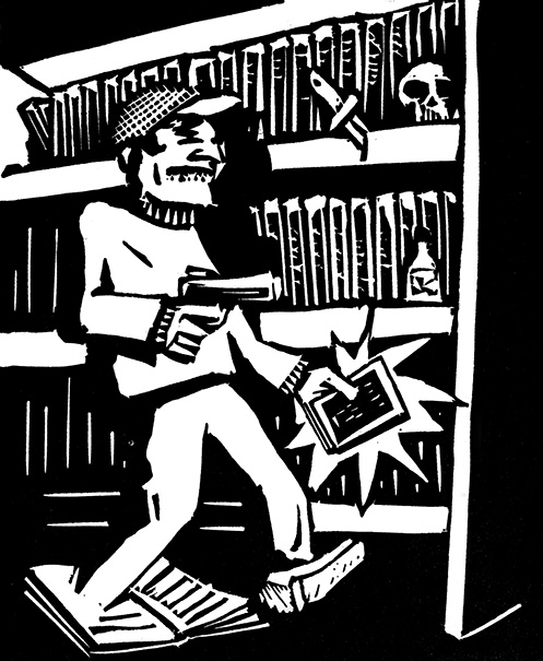 Petit clin d’œil à l’ami Pierre qui fut (entre autres, voir par ailleurs) le déclencheur de mon expérience de graveur. En l’occurrence: la suggestion d’appliquer, pour achever sa collection frénétique des 813 premiers numéros de la Série Noire, une des 813 méthodes homicidaires qui y sont décrites. Seul moyen peut-être d’avoir enfin une première édition en état craquant neuf (couverture souple, le cartonnage n’arrive qu’au n°9) du n°5 Neiges d’antan, jamais réédité dans la Noire.