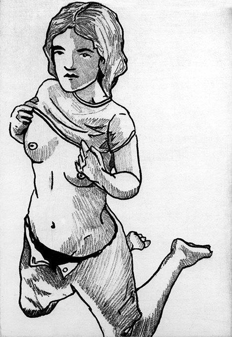 Carence qu’il s’agit à présent de combler. En avant pour le modèle nu, les bouquins d’études anatomiques; sortilège du croquis, je remplis des carnets entiers. Il me faudrait évidemment une bonne vieille formation à l’ancienne (à l’Académie de la rue du Midi, fut un temps, on emmenait les dessinateurs à la morgue dessiner des muscles décharnés), mais je bosse, et d’ailleurs il n’est même pas certain que ça existe encore (vu l’orientation résolument conceptuelle de l’enseignement artistique désormais). Donc, on y passe ses soirées et -sans être du Michel-Ange- on se sent forcément progresser.