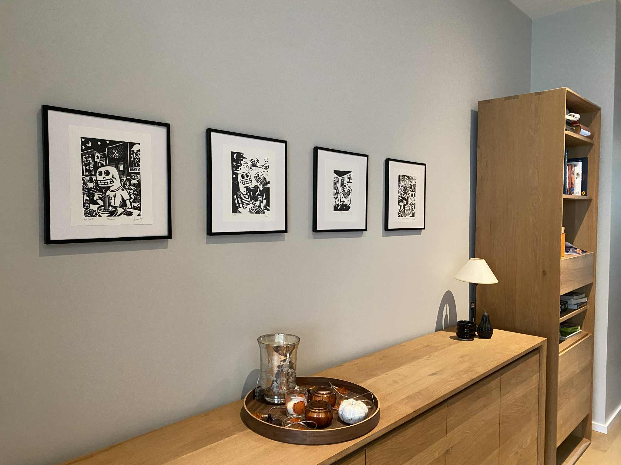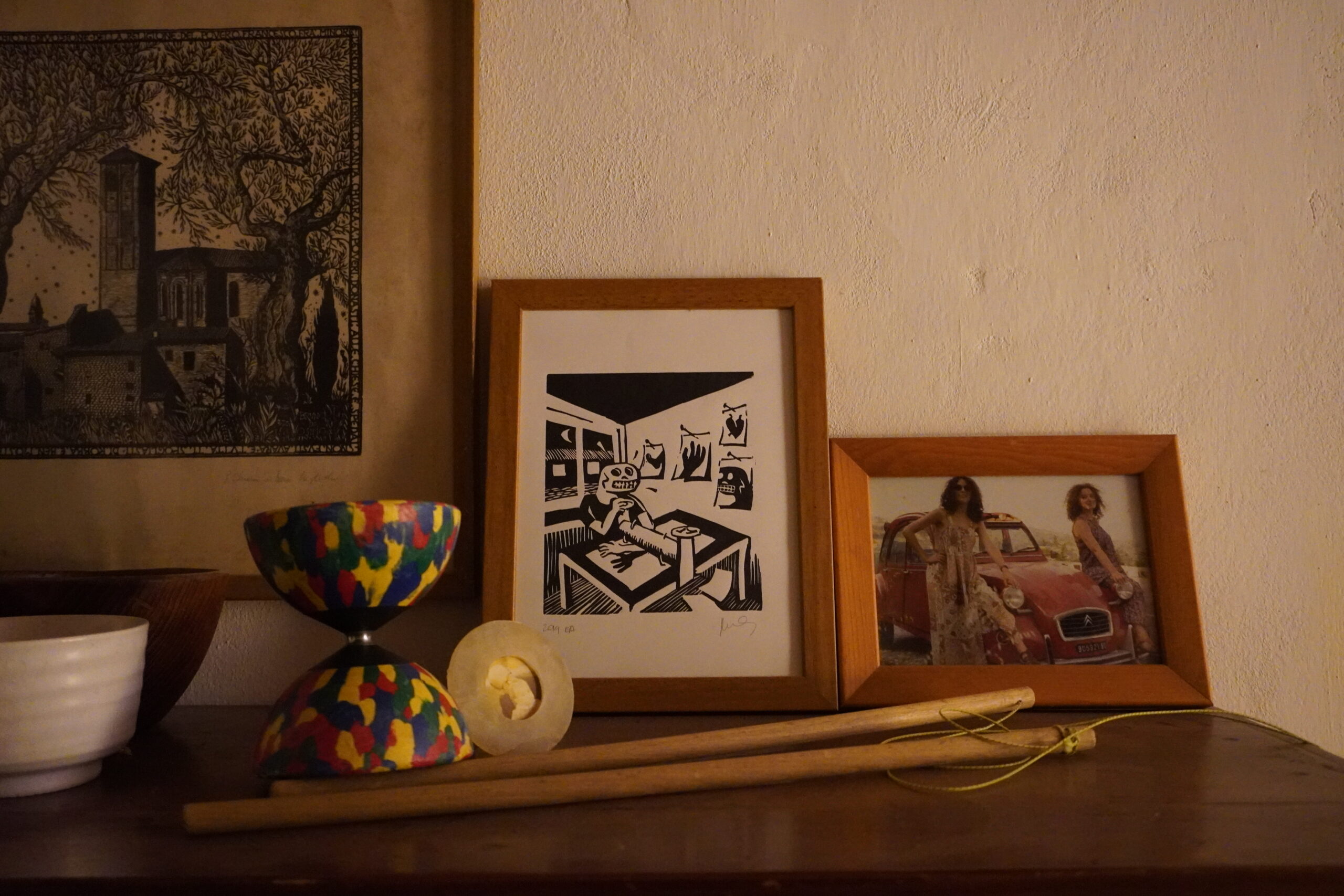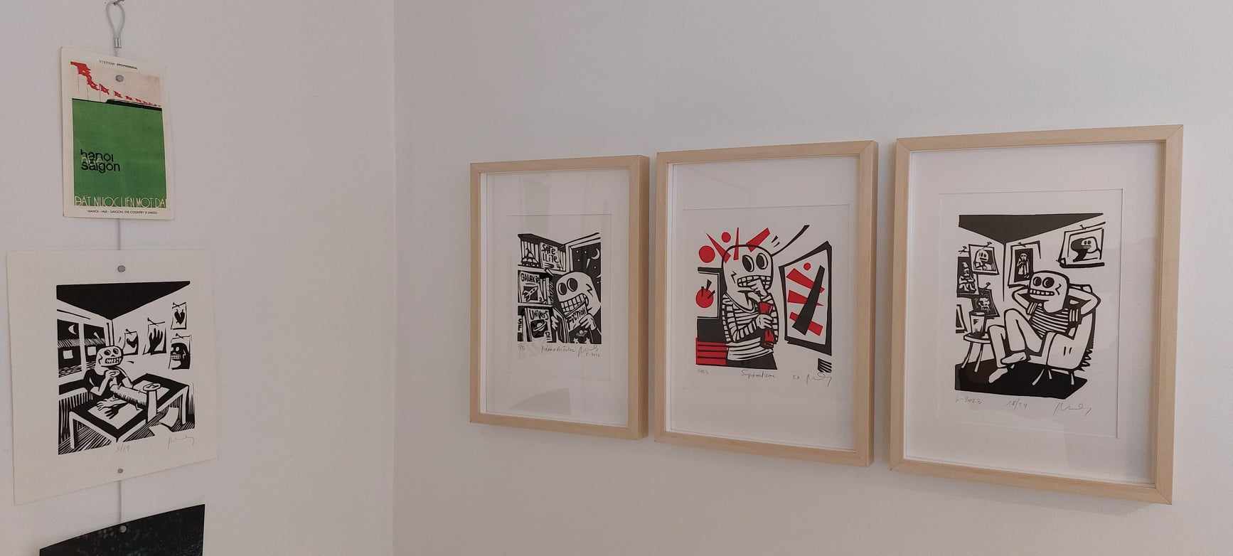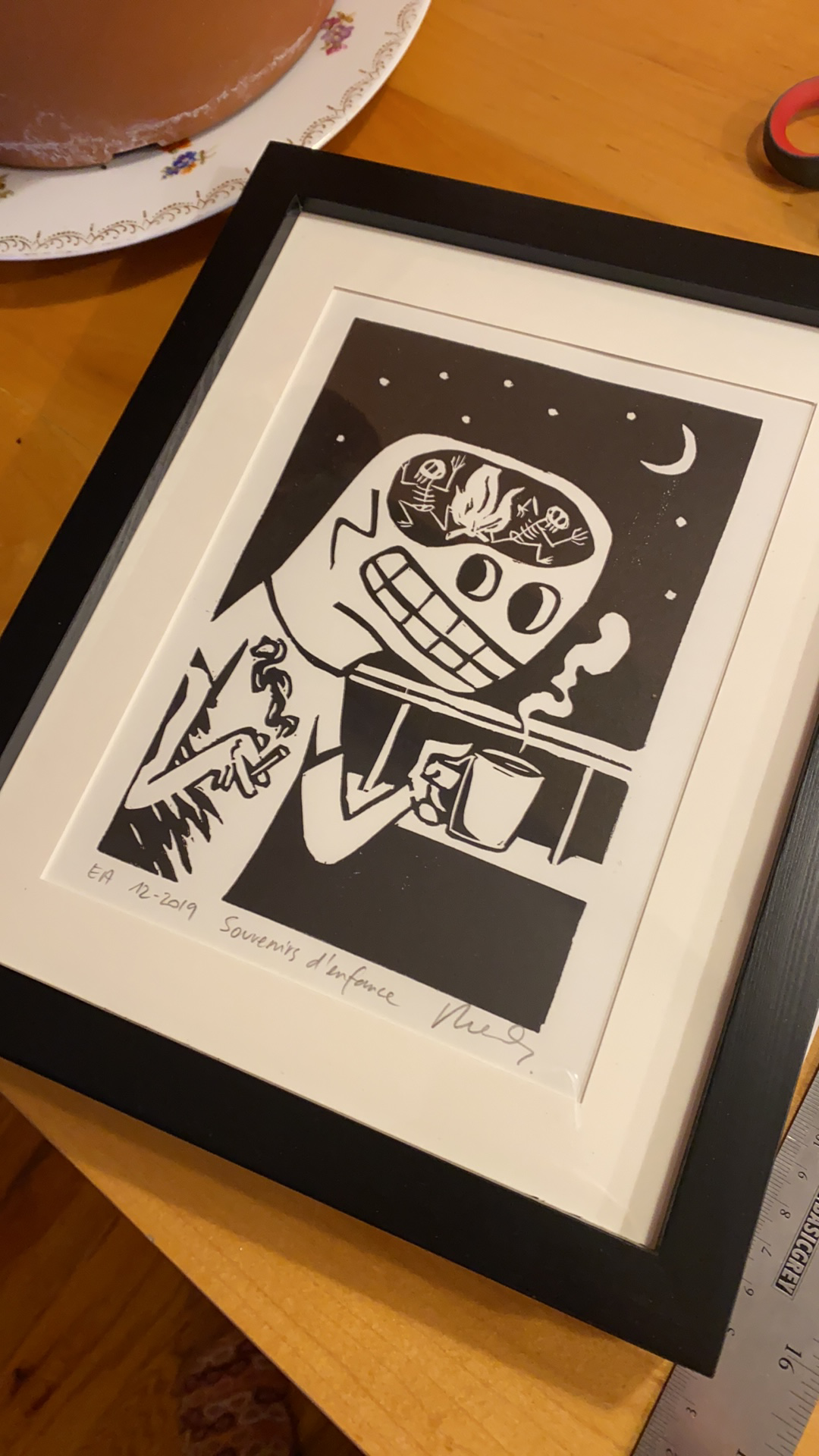 On hait bien la préparation (encadrement, passe-partout, accrochage) donc on procrastine. Mais c’est l’occasion de boire du vin au vernissage (et en 2024 de recevoir un prix) et de voir passer les potes. Leçon d’humilité aussi : en vérité tout le monde s’en fout et c’est très bien comme ça. Jusqu’ici surtout à l’atelier (on ne compte pas les expos permanentes chez les potes, salut Céline !).
