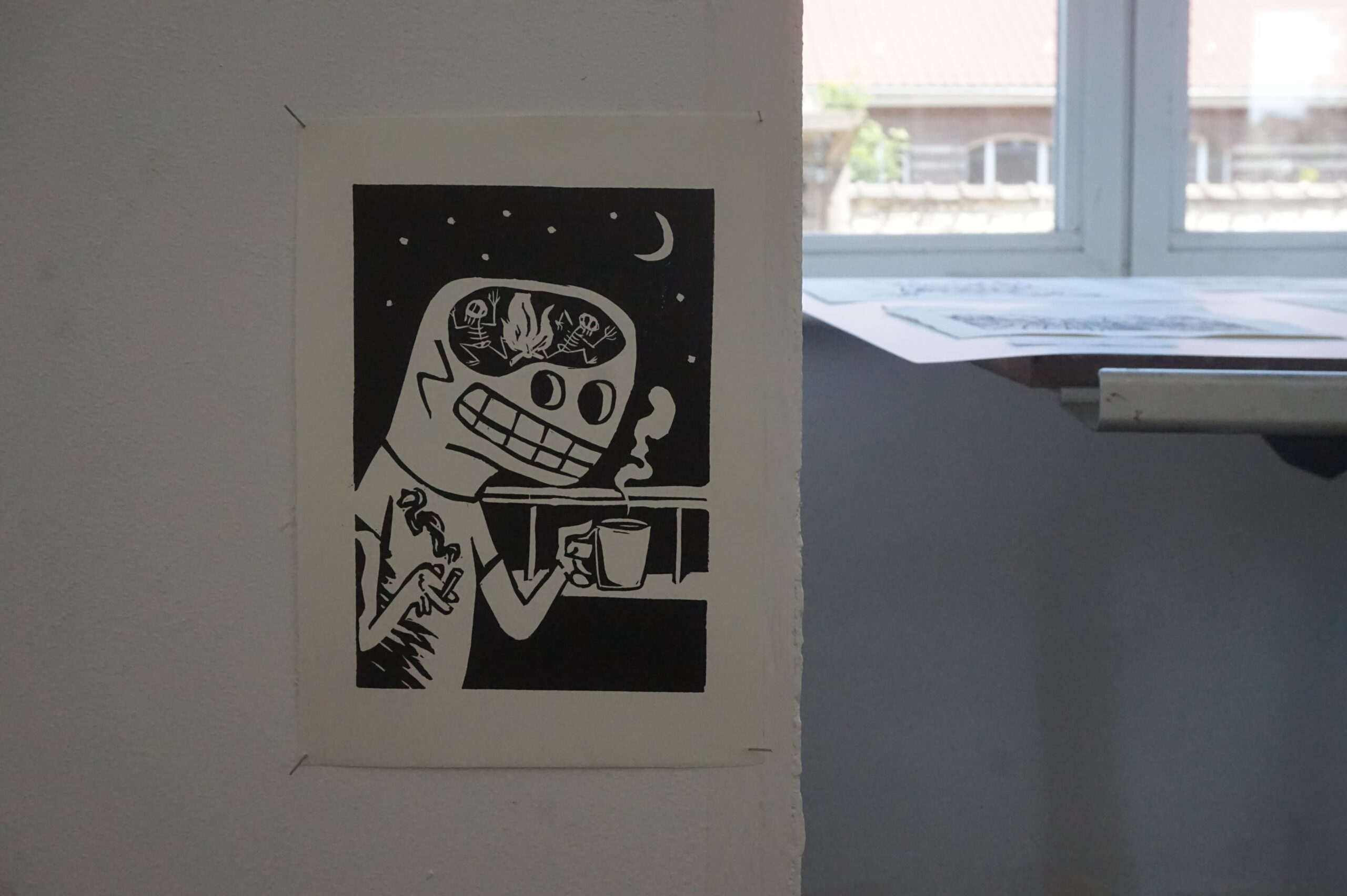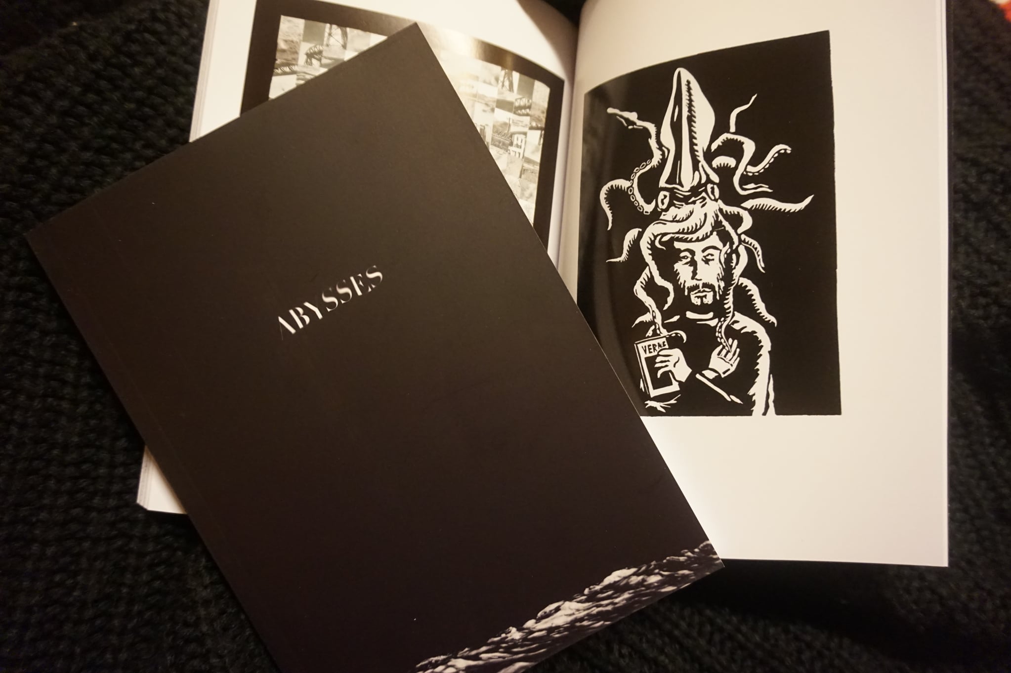 Dans la revue Chaos Technique 5, spécial Abysses. Circulent quelque part des exemplaires de Chaos Technique 4 avec également une lino calavera, mais le tirage a été épuisé avant que je n’en aie un. Dans les deux cas c’était à l’initiative de Juliette, partie à Paris depuis lors entamer une carrière de bouquiniste.
