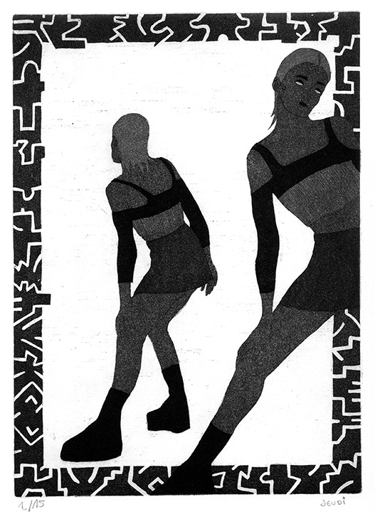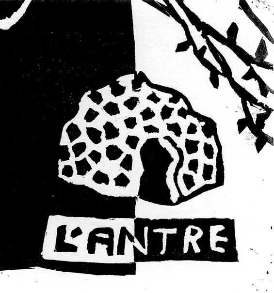 Elle a été réalisée par Juliette « la Punkette », alias Jeudi, qui a commencé en même temps que moi la gravure. C’était une très chouette copine d’atelier, partie ensuite faire de la librairie en banlieue parisienne (snif). Elle m’a aussi publié dans sa revue collective (voir rubrique « contagion »). On ne se voit pas assez, dernière fois c’était au café à côté du Père-Lachaise, et elle m’avait offert un super livre 3D, et j’ai encore une pile de livres cyberpunk 1980s à lui refiler. Voilà d’autres gravures que je suis parvenu à lui chiper à l’époque. Je trouve encore son logo « l’antre » incroyablement efficace, je rêve d’être aussi minimal et évident dans mes propres linos (j’en suis loin).