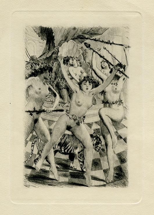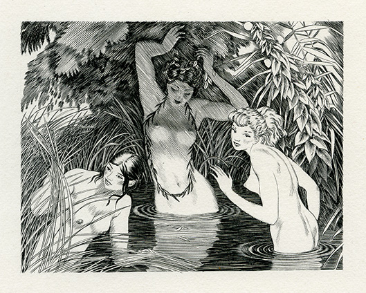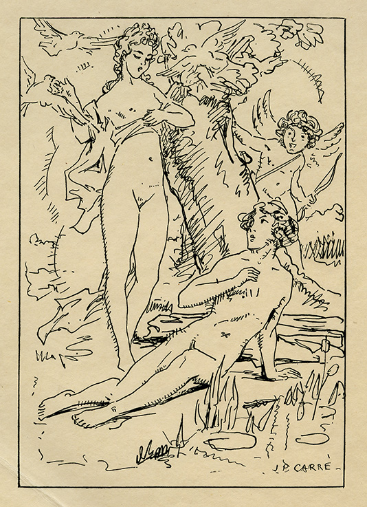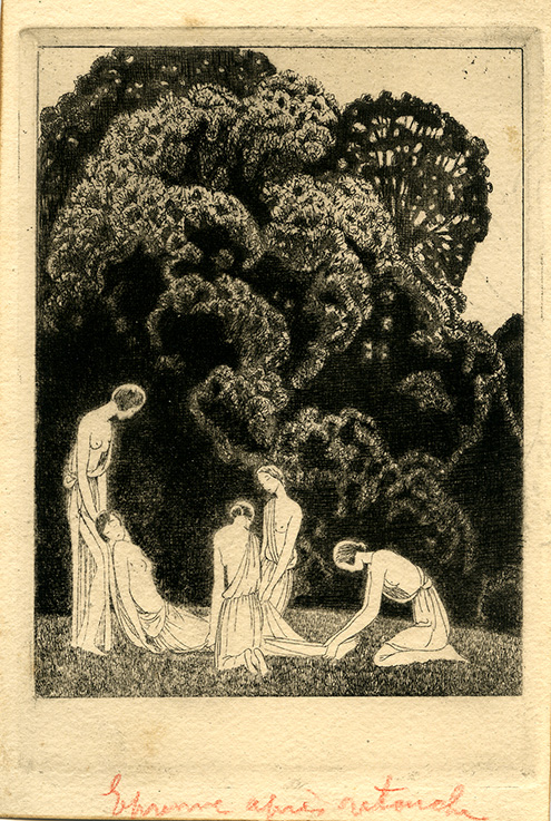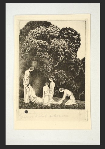 La vieille vendeuse à Gand m’a assuré que c’était « l’illustrateur de Maeterlinck » (écrivain symboliste: Serres chaudes, etc). J’ai d’abord cru que ce devait être Georges Minne (né à Gand, 1866-1941 – ils ont des sculptures de lui au MSK Gent), mais le style de ses dessins ne collait pas. J’ai cherché page après page ensuite dans mes livres sur Charles Doudelet (1861-1938, mort à Gand – cf jolie expo au Musée Rops à Namur il y a quelques années). Toujours rien, mais je n’ai pas son catalogue raisonné non plus; cela dit il y a une certaine légèreté dans la gravure qu’on ne retrouve pas dans son travail. Au final, en feuilletant par hasard un bouquin sur Maeterlinck et l’art, je tombe sur le nom d’André Edouard Marty (1882-1974) qui a illustré sa pièce L’Oiseau bleu. C’est plus tardif (le style est plus art déco que symboliste), ce qui colle avec les personnages, j’aurais dû y songer. Difficile de dire d’où sort cette gravure en particulier. Un exemplaire moins fringant (en état antérieur? ou sur une plaque abîmée?) est renseigné dans une vente aux enchères sur le ouèbe. Ca pourrait venir d’une de ses éditions de Pierre Louÿs (les Chansons de Bilitis, ou Aphrodite – ceux de ma bibliothèque ne sont pas de sa main) ou d’un des livres d’antiquité grecque (ou pseudo-) qu’il a illustrés (Scènes mythologiques? Daphnis et Alcimadure? Les amours pastorales de Daphnis et Chloé? Callisto? Poésies de Sapho?). Je cherche, je poserai ici si je trouve une édition.