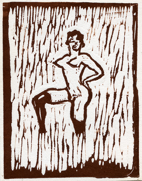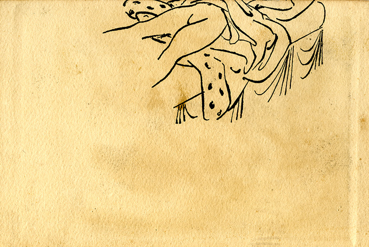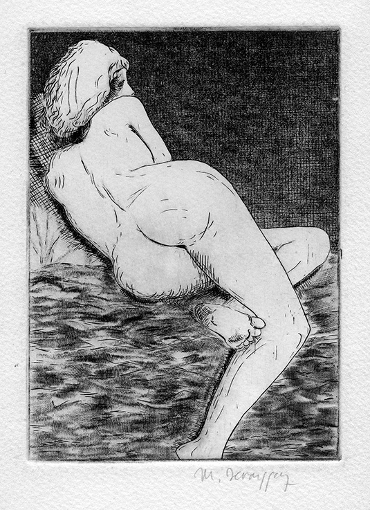 En démontant le cadre, j’ai découvert qu’au dos de l’épreuve – imprimée sur papier de récupération- il y avait la moitié d’un dessin de nu que je publie ici en exclusivité: