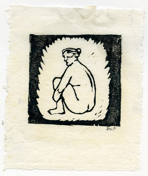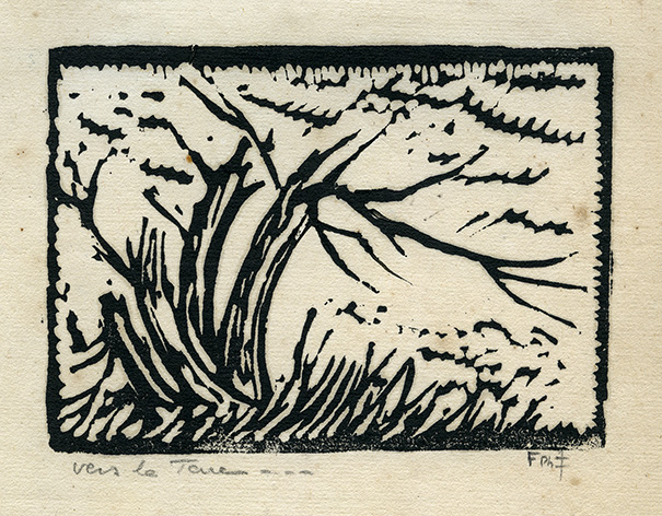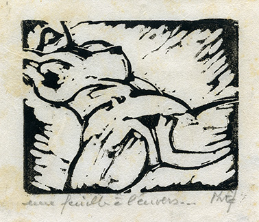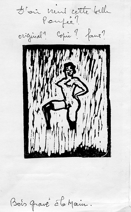 Puis une fardelette qui contenait plusieurs gravures signées « F Ph [croix de Lorraine]« . Moitié images bucoliques, moitié modèles nus; dont une version (sur gomme? ou bois?) de L’Origine du Monde de Courbet, en version expressionniste (planquée sous une autre, comme le tableau original était planqué chez Lacan). Une seule aquatinte d’un style assez différent. A noter qu’un précédent propriétaire indélicat a tout collé avec du tape calamiteux (d’autant que le papier est très délicat). J’entends que ça colle au style ‘expressionniste’, mais j’ai tout de même du mal avec les impression mitées (pourtant devenues ultra-majoritaires). Pour moi si il y a des manques, il faut habilement combiner un poil de pression en plus et/ou un encrage plus régulier. J’ai jeté des épreuves personnelles pour des manques moins visibles que ceux-ci. C’est évidemment un débat où je défends une position d’arrière-garde: la gravure étant un médium de reproduction, si on veut jouer sur le résultat, il faut travailler la plaque pour obtenir un tirage homogène, et pas imprimer des séries dépareillées avec des « effets » hasardeux dus à des accidents techniques. Autant vous dire qu’on se sent bien seul ces jours-ci en défendant cette citadelle, pas exactement dans l’air du temps – qui souffle plutôt vers les « accidents heureux » et autres techniques approximatives. Pour revenir aux épreuves de cette fardelette, le précédent propriétaire a aussi noté diverses considérations curieuses (quoique très dispensables) autour ou au dos des bois « nus », jugez plutôt :