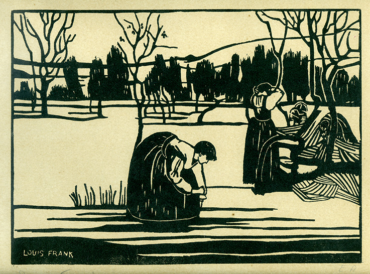 Dans un autre genre, ces deux bois plus anonymes, achetées à 10 centimes d’euros pièce à Anderlecht (cadre dégueulasse fourni en prime). Un bois « Fréjus » par C.R. (?), sur un carton collé à un cadre qui sent bon les années 30/40. Je reste assez perplexe devant le papier sorti du cadre: pas de certitude à 100% que ce ne soit pas une reproduction mécanique d’un certain âge. Un autre bois (le thème me laisse de marbre mais j’aime bien le traitement graphique) signé Louis Frank. Il y a plusieurs homonymes, certains plus fréquentables que d’autres (un avocat du droit des femmes, un sale con de ministre des colonies, un paysagiste australien soporifique…), mais aucun qui semble s’être fait remarquer par ses gravures.