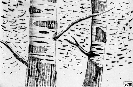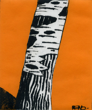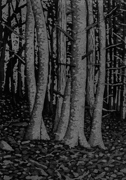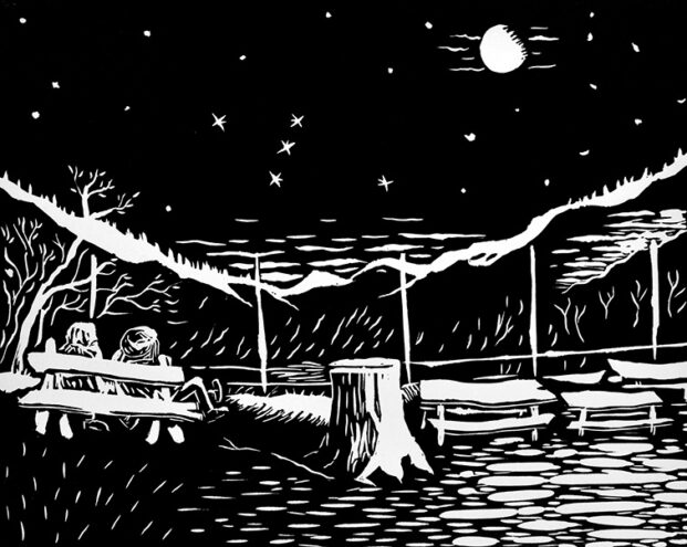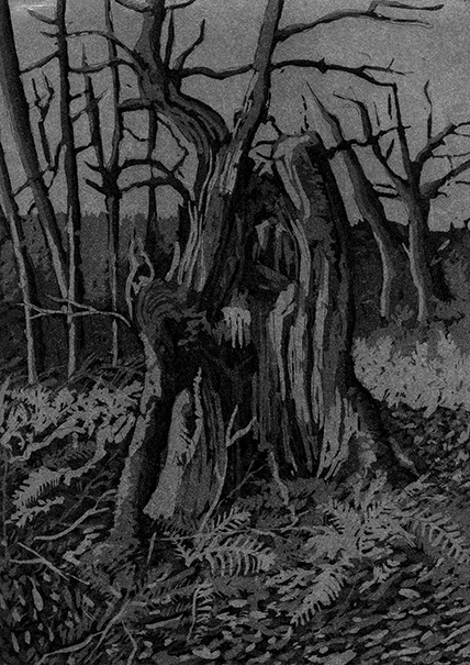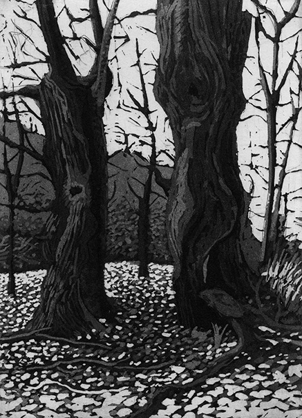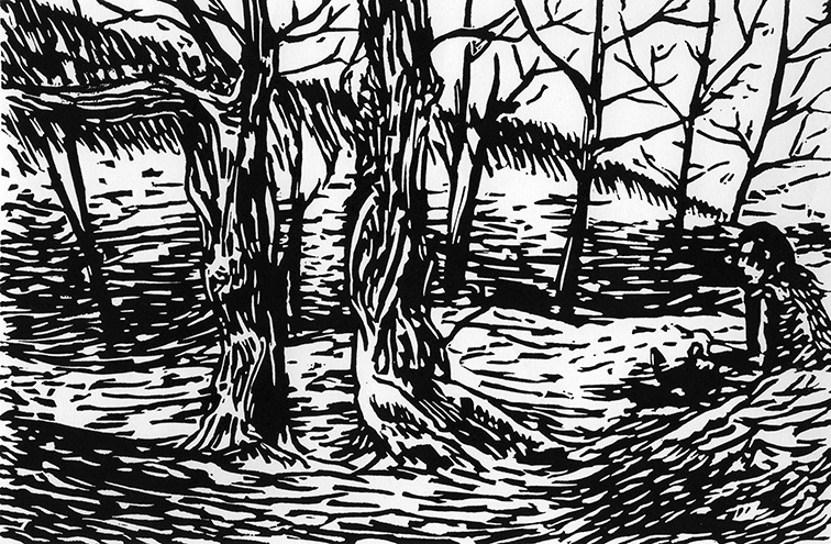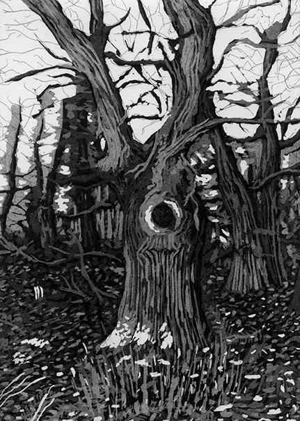 Au matin, l’eau la plus froide, le feu que l’on ravive et, sur le sentier, un lambeau de viande -ce sont des montagnes à loups. Plusieurs images de ces journées se sont par la suite imposées comme pierres de sentier mental, inspirant mes premières linogravures. Ici, ma deuxième lino qui représente une déclaration d’amitié. Et à côté, le vieux châtaigner creux.