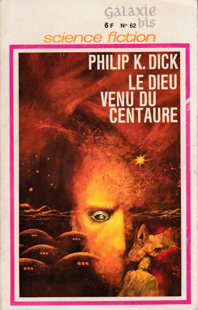 Collection sans fin qui ne va pas sans poser quelques soucis d’occupation et de partage de l’espace, comme ma recherche de toutes les éditions (et tous les retirages des mêmes éditions, et toutes les revues etc) de Philip K. Dick que j’ai dû me résoudre à apporter au boulot pour ne pas périr enseveli. Dont une dizaine de versions différentes du Dieu venu du Centaure, ou plutôt les trois Stigmates de Palmer Eldritch selon le titre original. Ledit Palmer qui revient du susdit Centaure avec des yeux, une main et une mâchoire de métal afin de pervertir définitivement la réalité.