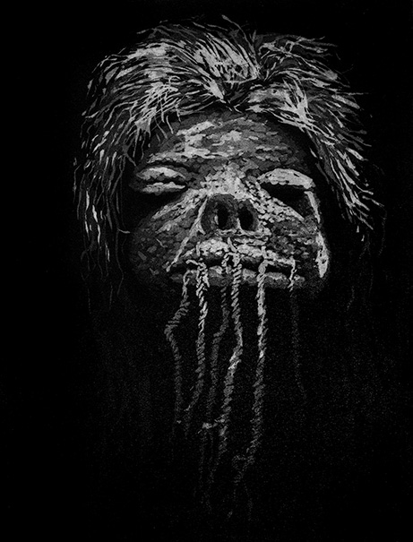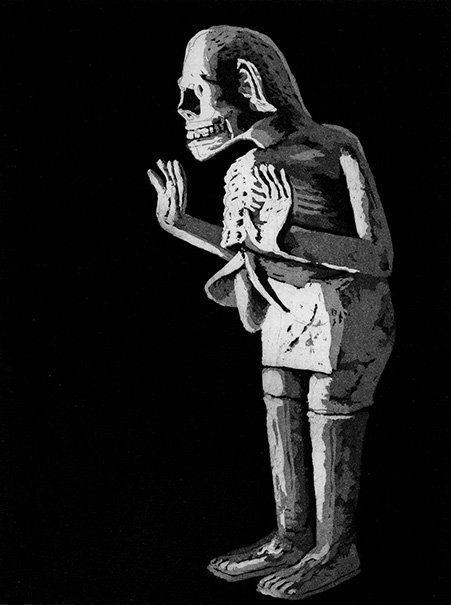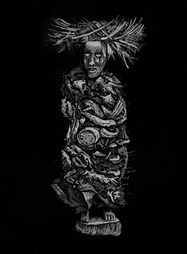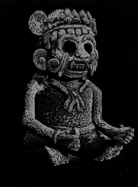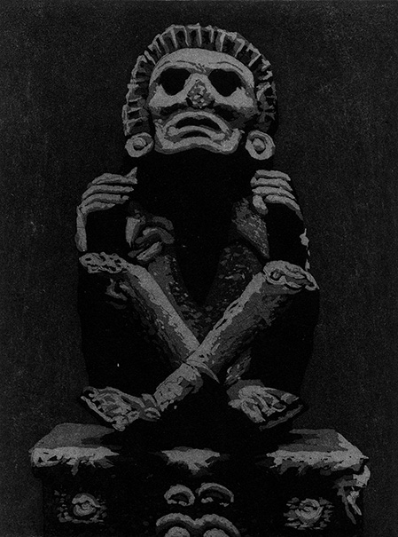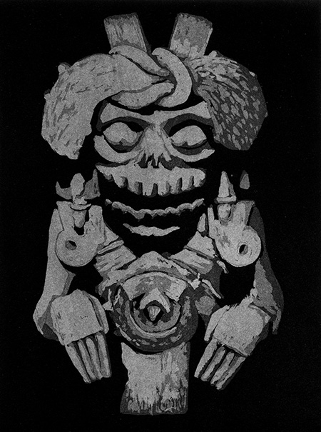 La mort fleurie, la fleur létale : statuettes de sacrifice, prêtres revêtus de peau humaine, Dieu de l’eau au visage mouvant en volutes de serpent, Notre-Seigneur l’Ecorché, inquiétude.