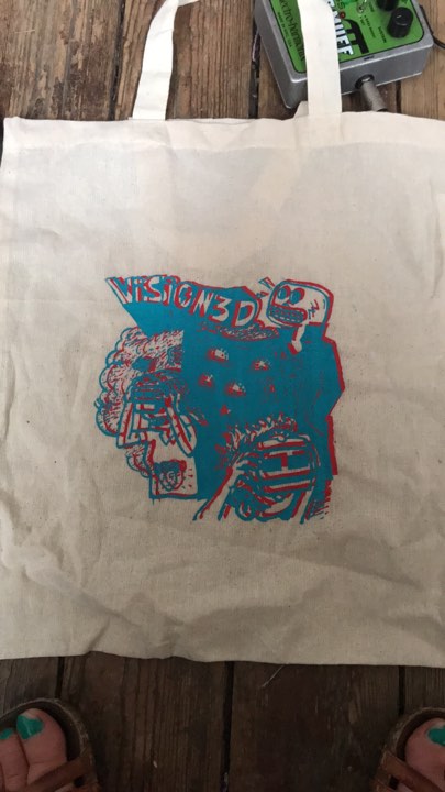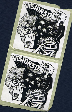Une lino avec un cadavre dealer de view-master. Utilisée pour des stickers, des t-shirts en sérigraphie (salut Cédric !) et des totebags.